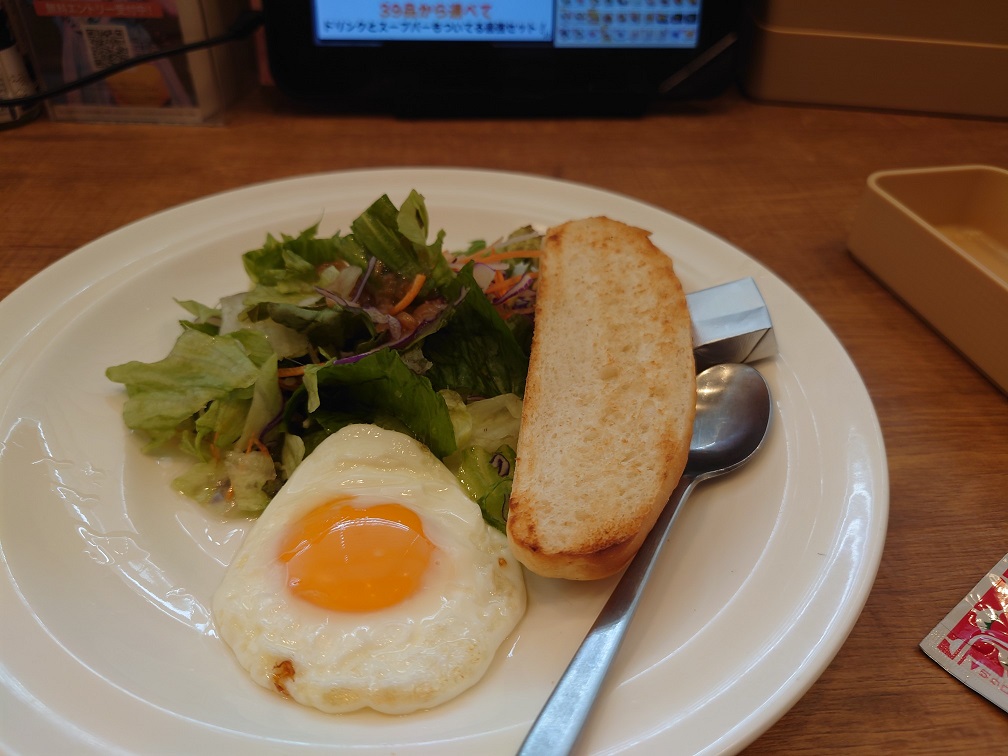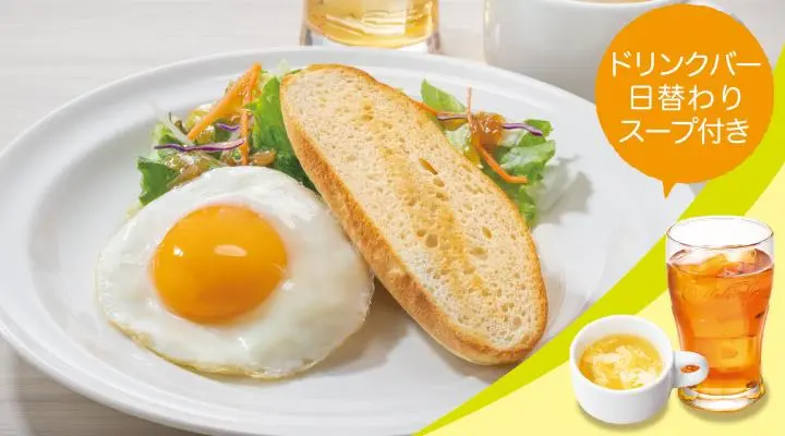 注文したのは、ライトモーニングプレート(税込500円)。ドリンクバーとスープバーが付いてこの価格。すでに“勝ち”が確定している。