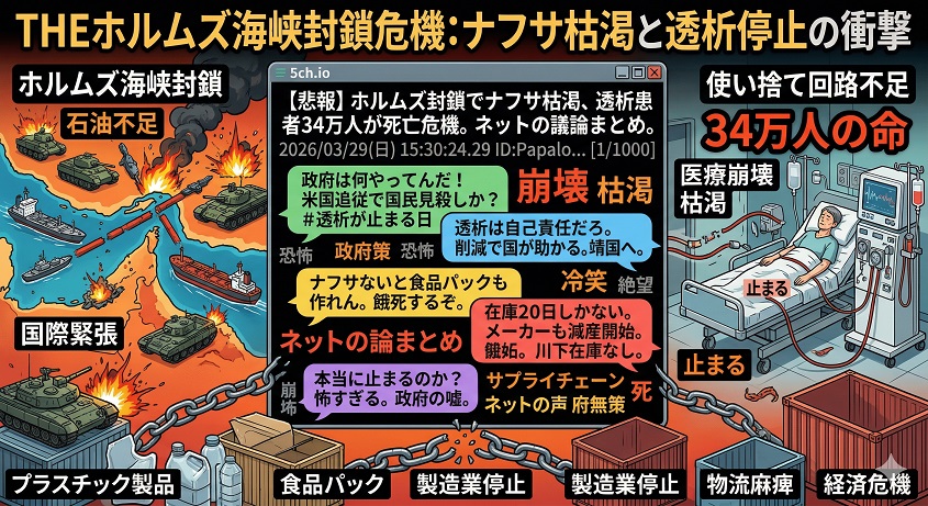 現在、ネット掲示板やX(旧Twitter)で「#透析が止まる日」というハッシュタグとともに、ある深刻な問題が急速に拡散されているのをご存知でしょうか。それは、ホルムズ海峡の実質的な封鎖に伴う**「ナフサ(粗製ガソリン)の供給不足」**です。